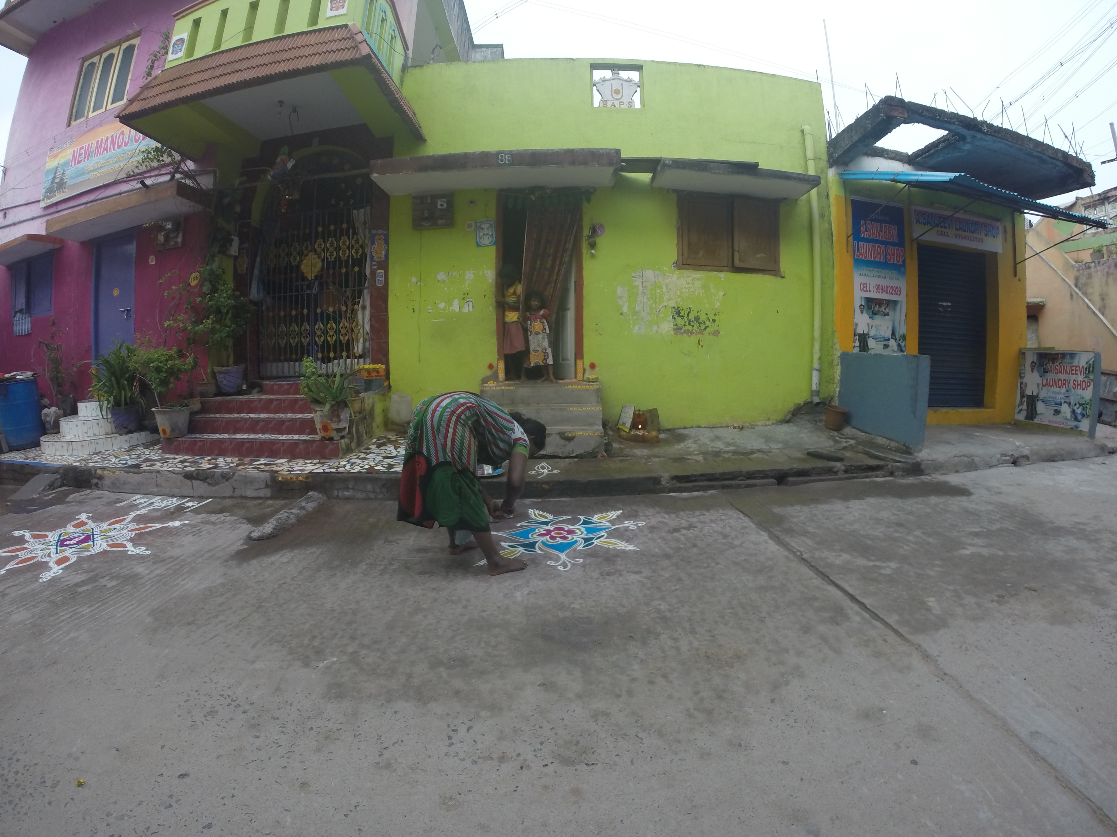 Every day, women of each household make kolam designs on the pavement outside the home for prosperity and good luck.
