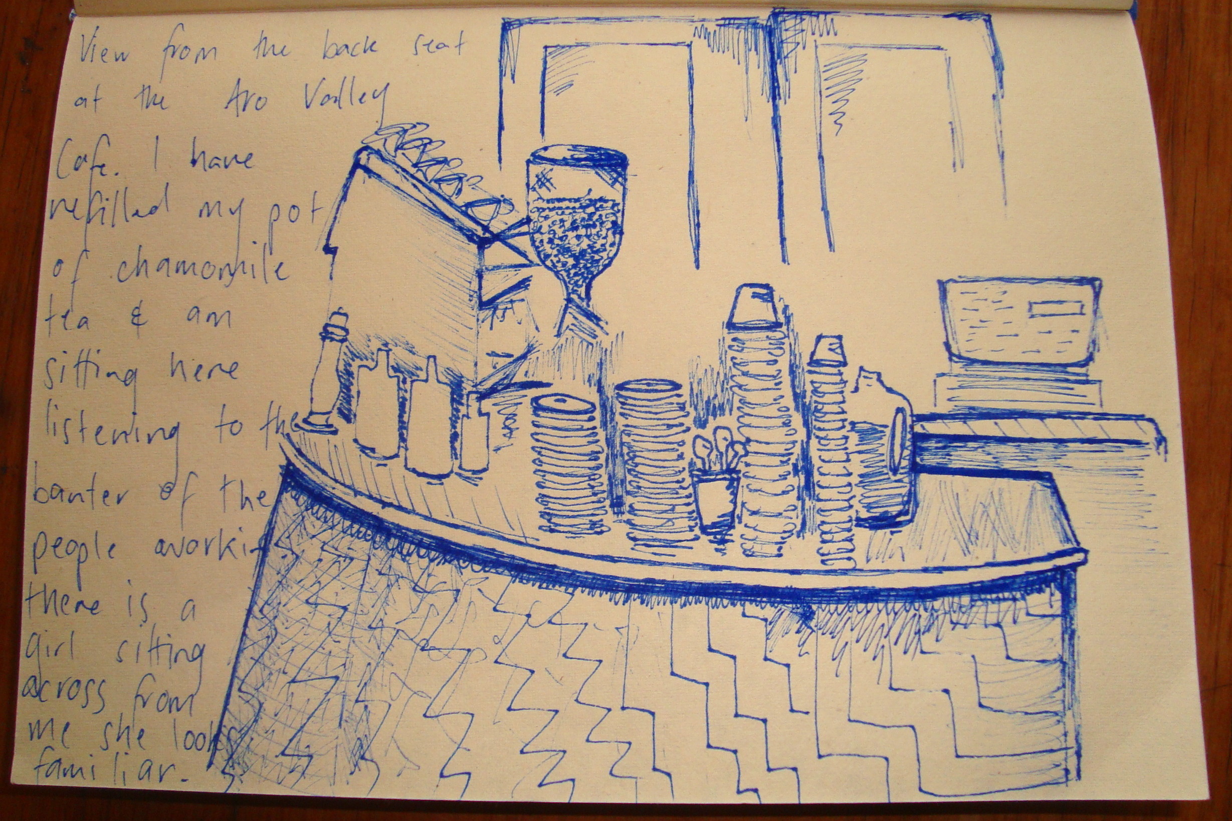 After a blustery and unsettling adventure in town today, I ended up at Aro Cafe with a cup of chamomile tea. Running out of reading supplies, I picked up my pen and drew what I saw in front of me. I spent about an hour drawing, which surprised me as I haven’t drawn anything in a very long time. I think the combination of having time for my creativity to grow out again, and focusing the time of the yoga challenge upon exploring and creating has reawakened my love of drawing.
